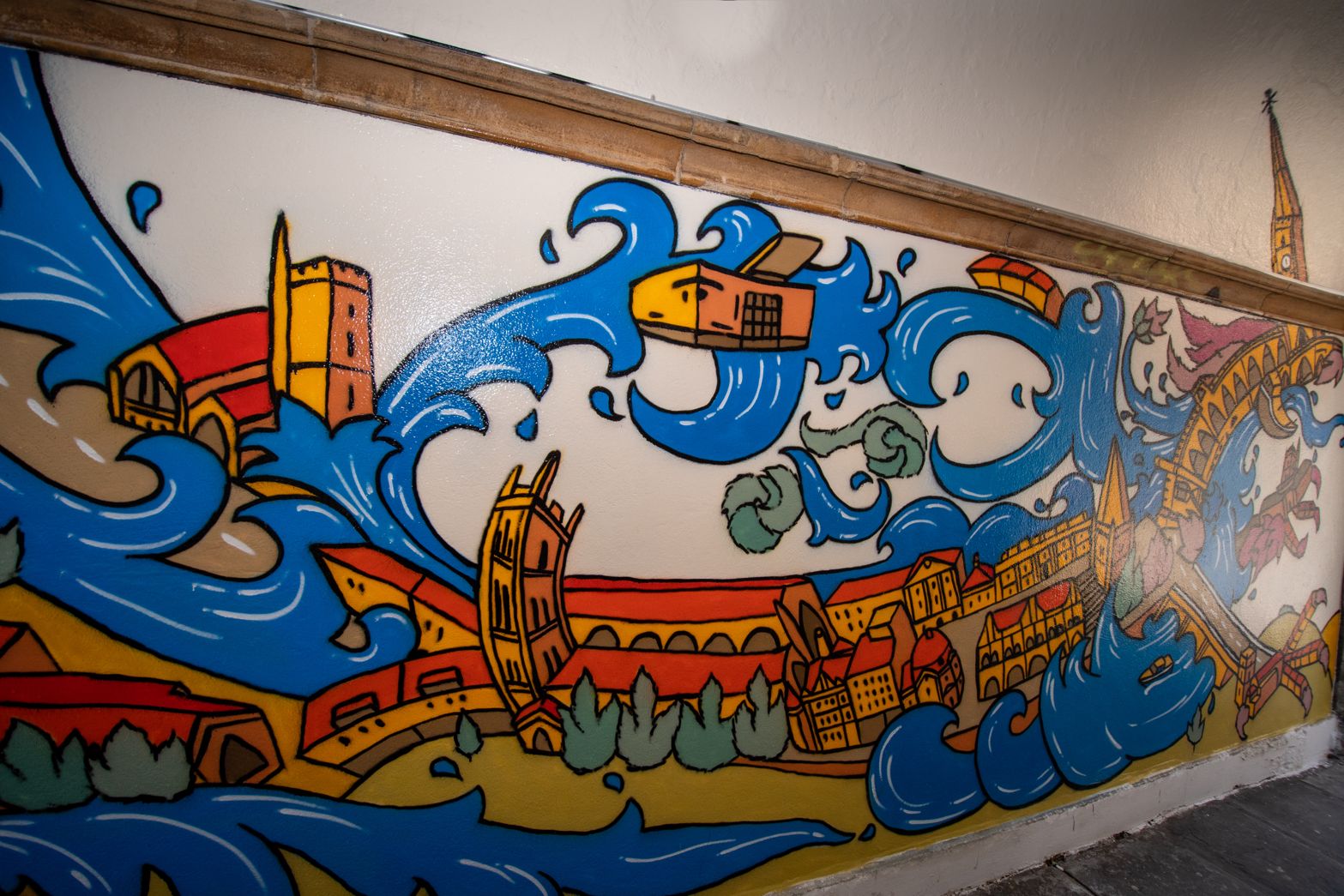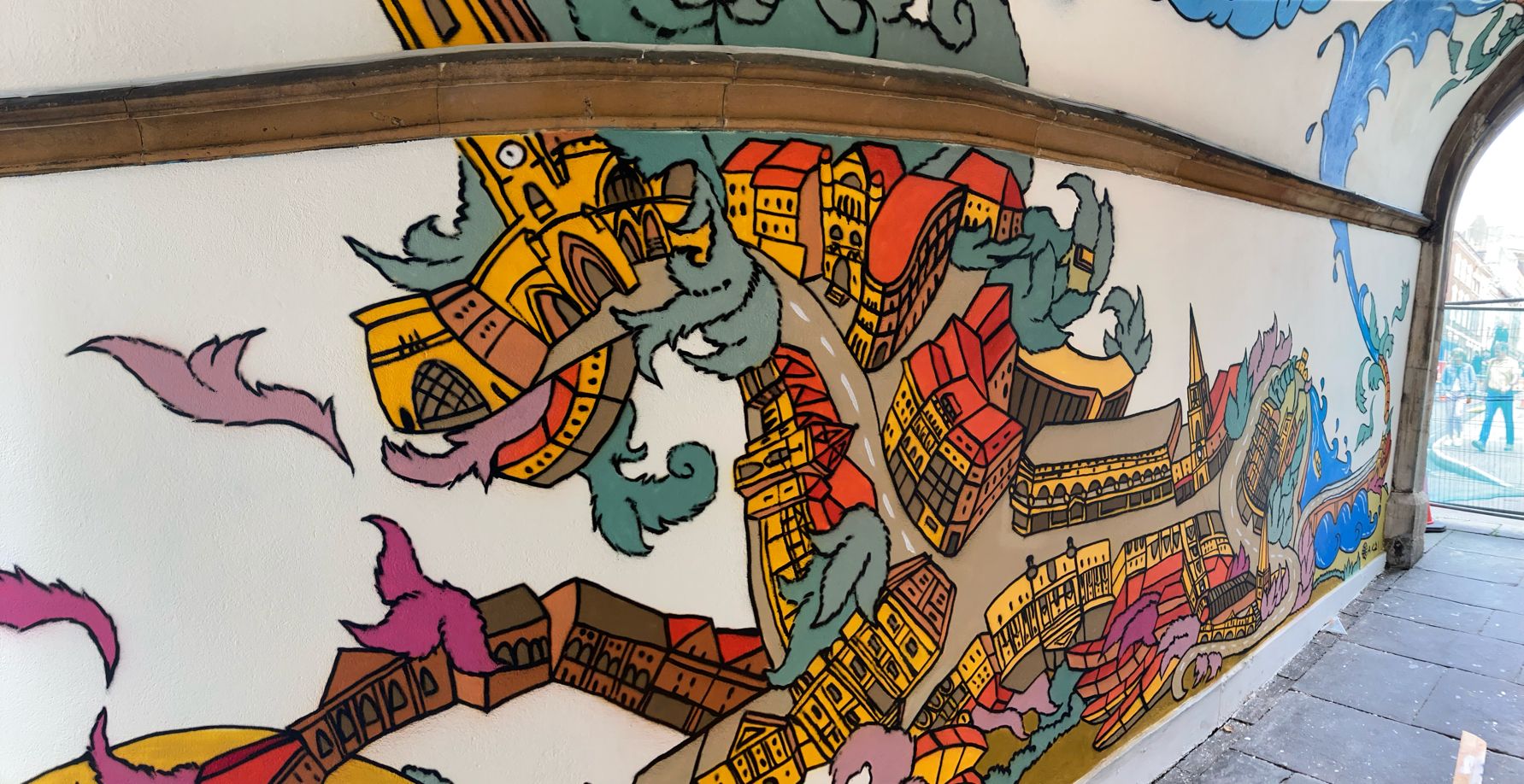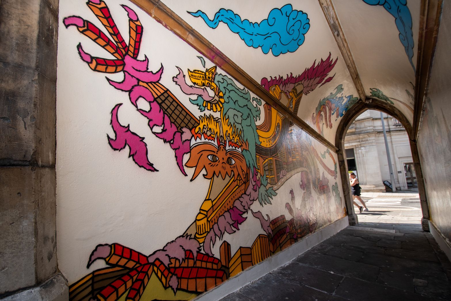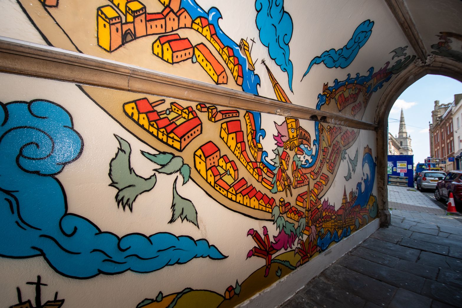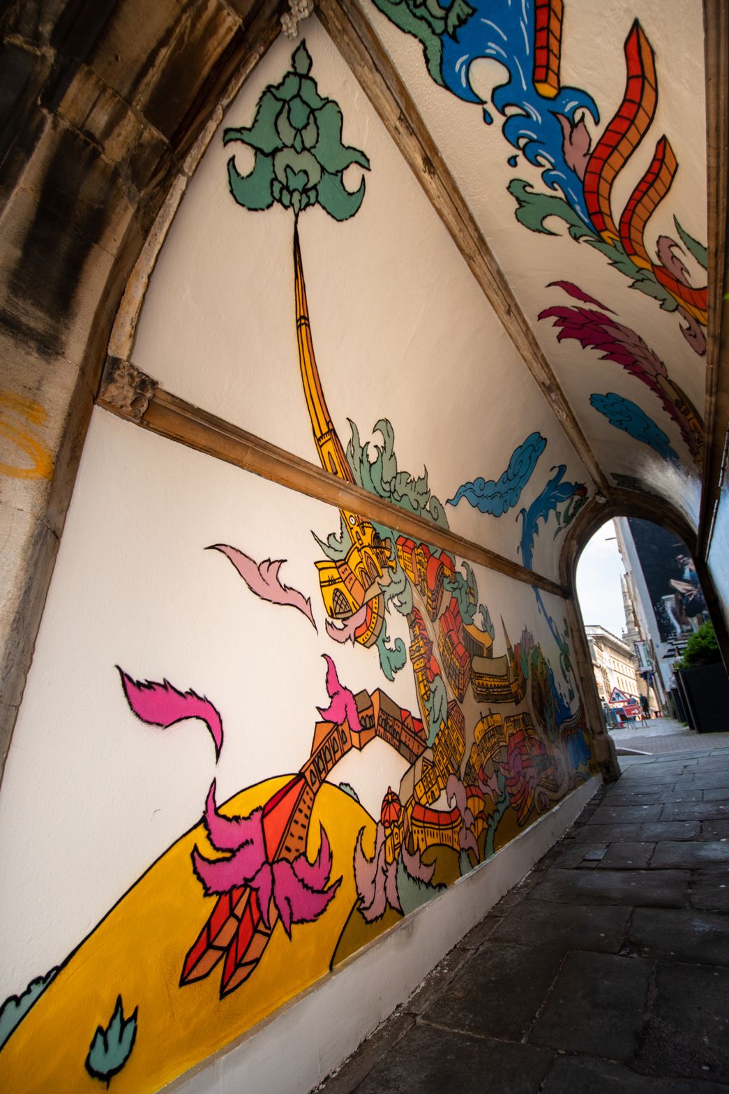 Murals painted in the pedestrian arches of St John On The Wall church, Bristol. Commissioned by Bristol City Council and Churches Conservation Trust.